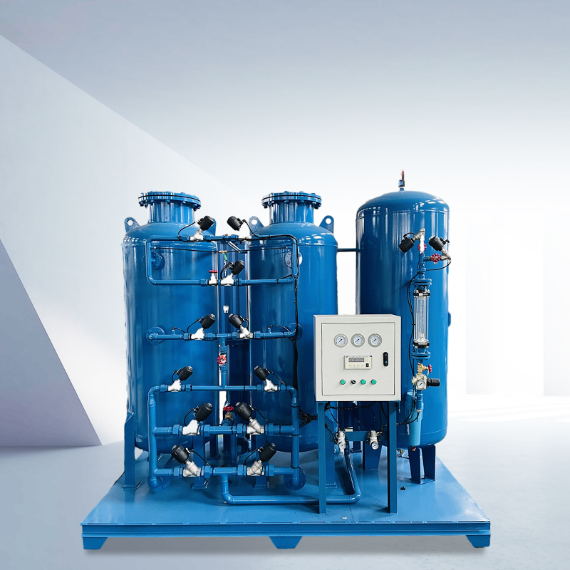 A nitrogen generator refers to a nitrogen production equipment designed and manufactured using pressure swing adsorption technology,which uses air as raw material and physically separates oxygen and nitrogen to obtain nitrogen.The nitrogen generator uses excellent carbon molecular sieves as adsorbents and uses the principle of pressure swing adsorption(PSA)at room temperature to separate air and produce high-purity nitrogen.Usually,two adsorption towers are connected in parallel,and the imported pneumatic valve is controlled by a PLC to automatically operate,alternating between pressurized adsorption and decompression regeneration,to complete nitrogen oxygen separation and obtain the required high-purity nitrogen.